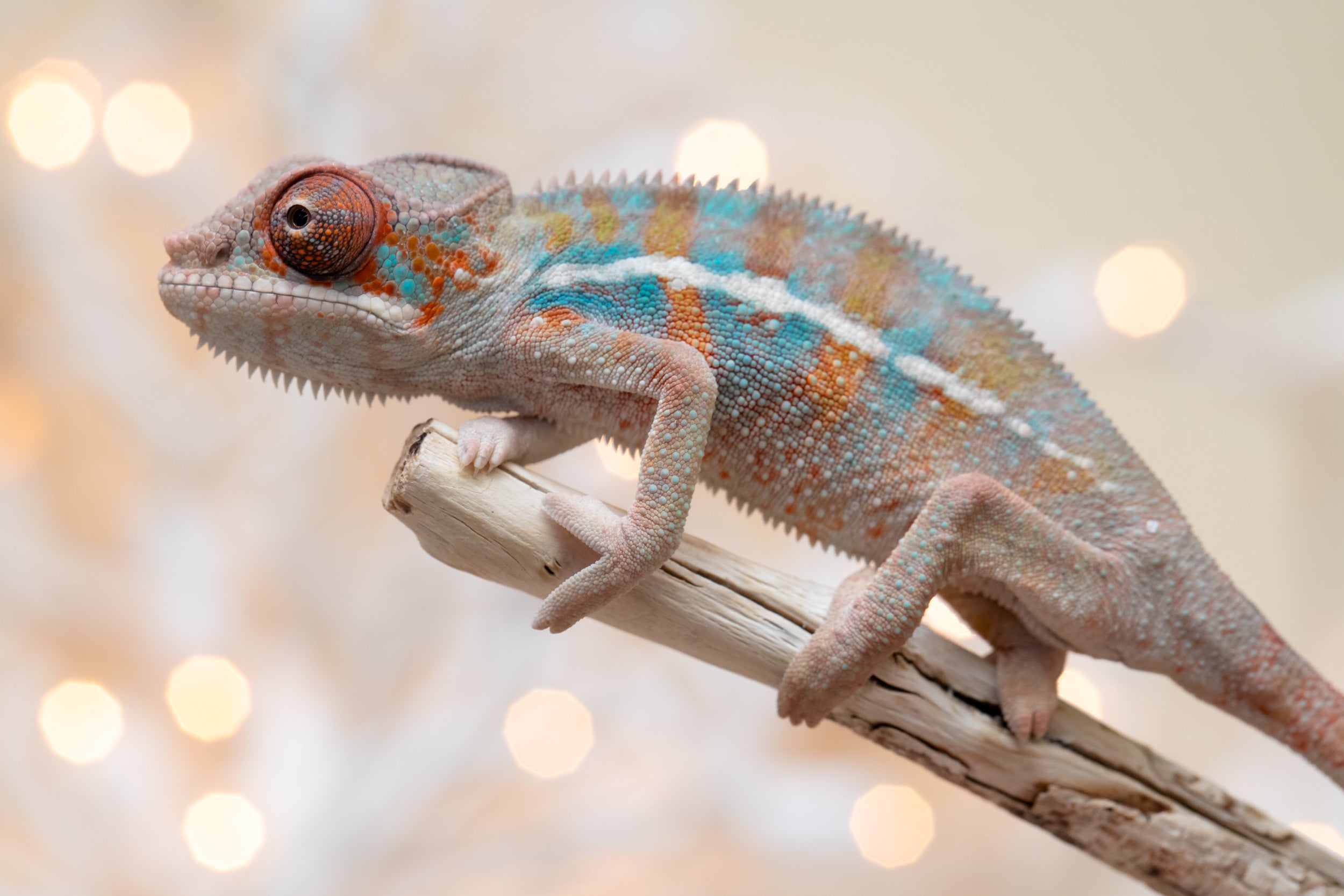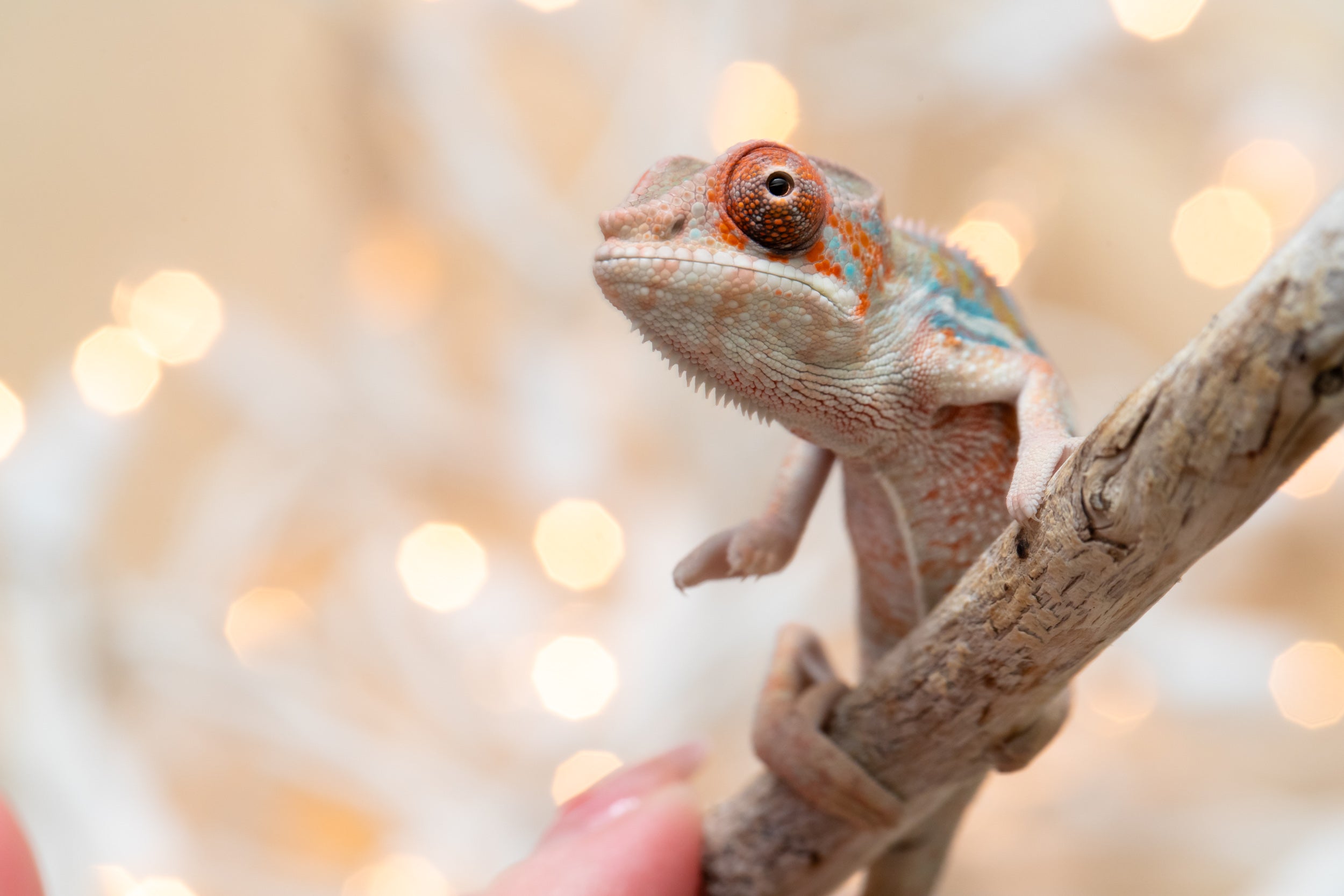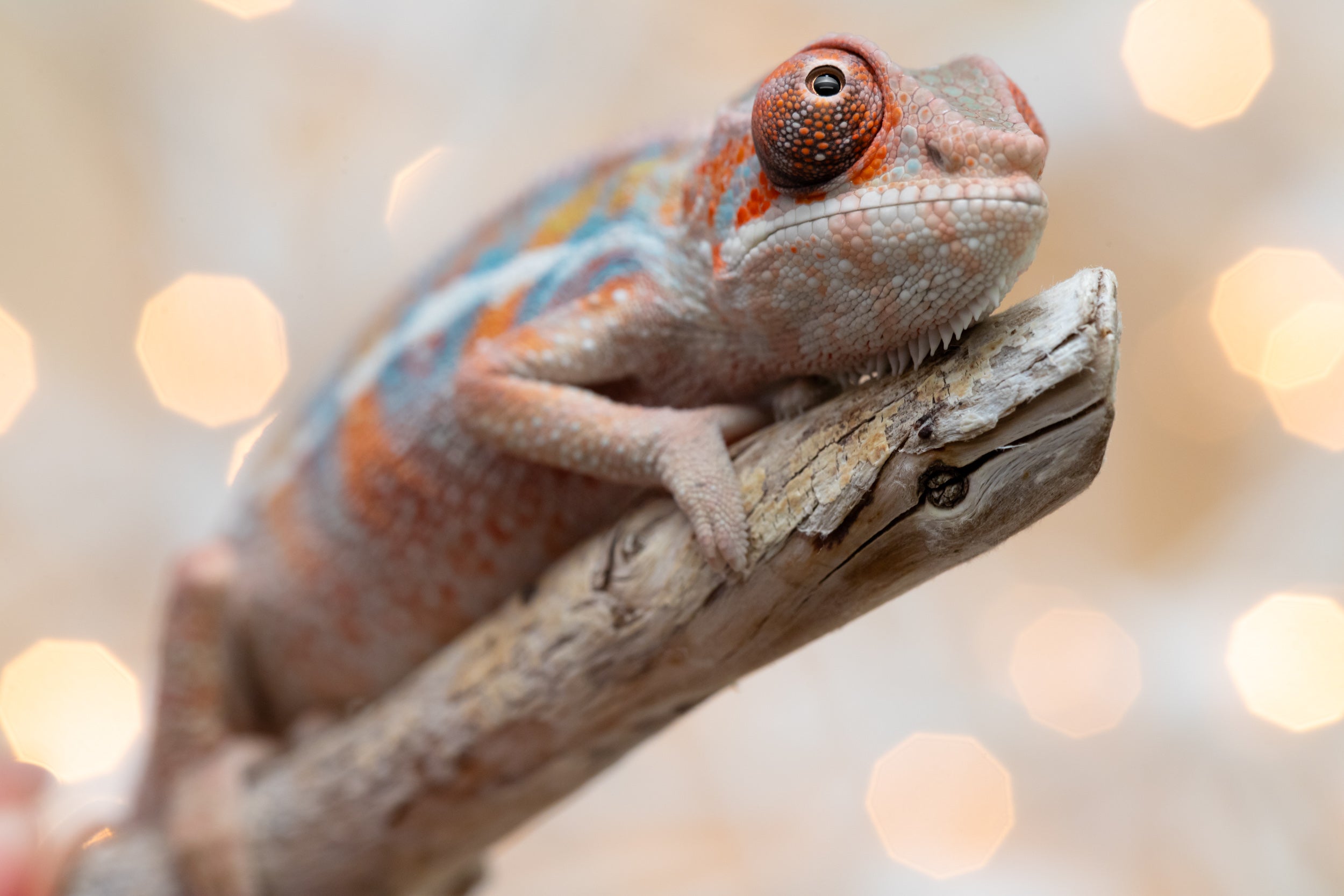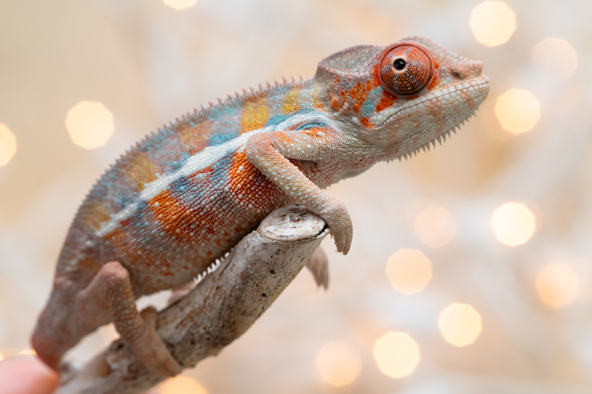 Baby Bio: OK, listen, this baby just absolutely stole the show!! And melted my heart in the process! A natural mood enhancer in baby chameleon form! Both his looks, and his personality were top notch. He is so little but already so colorful, I may as well have been photographing a 7 month old! And he could not have seemed more unbothered by the entire experience of having his first ever baby photo sesh! He has the sweetest face and the most beautiful coloring already. Lots of orange, defined blue bars, an ultra-clean pattern, and these big, beautiful orange eyes. I’m telling you, this little guy is special!