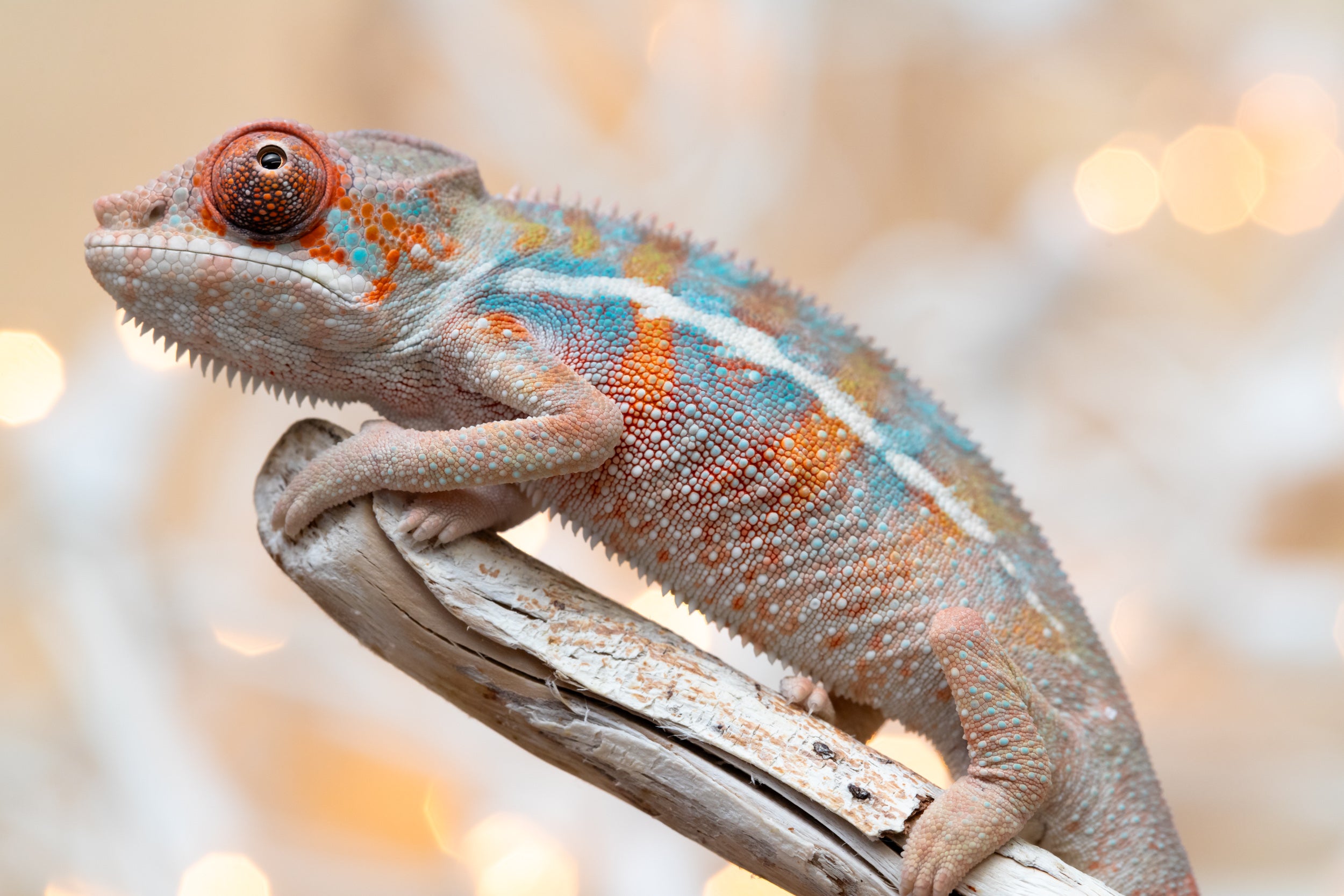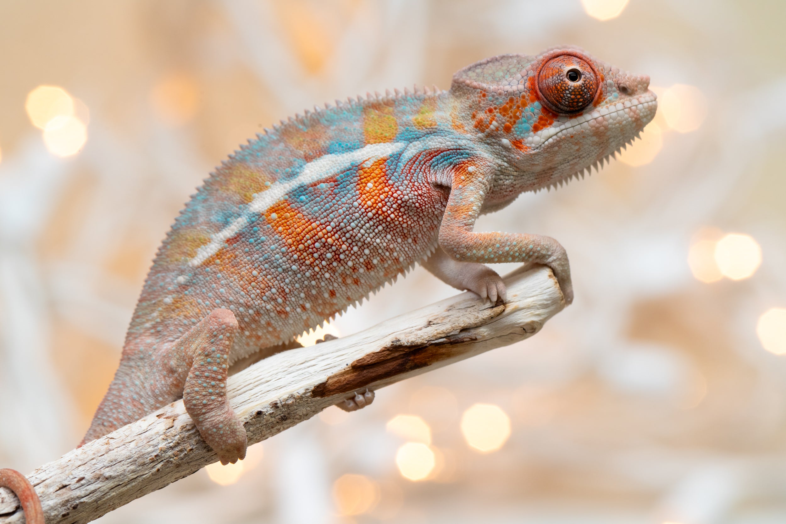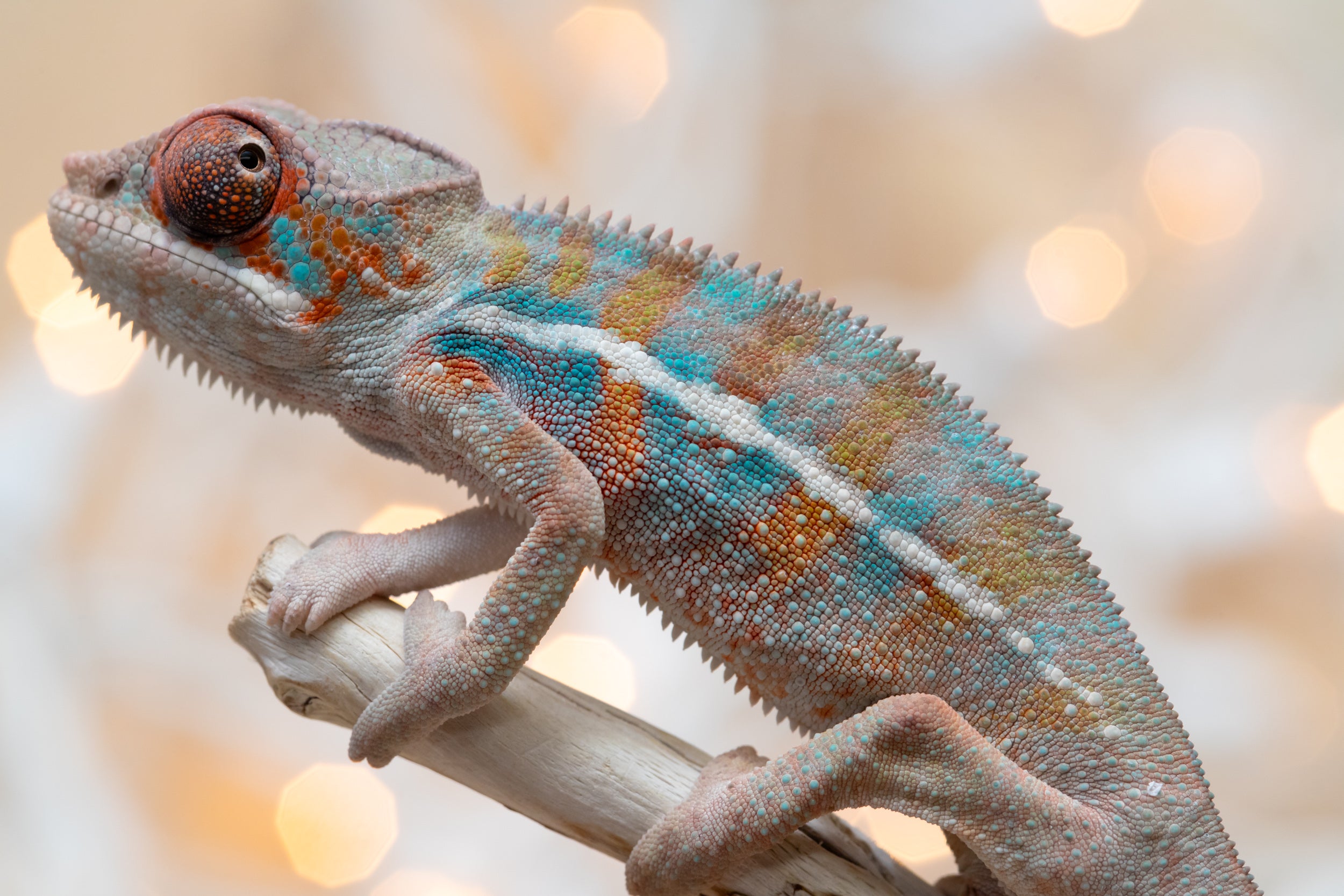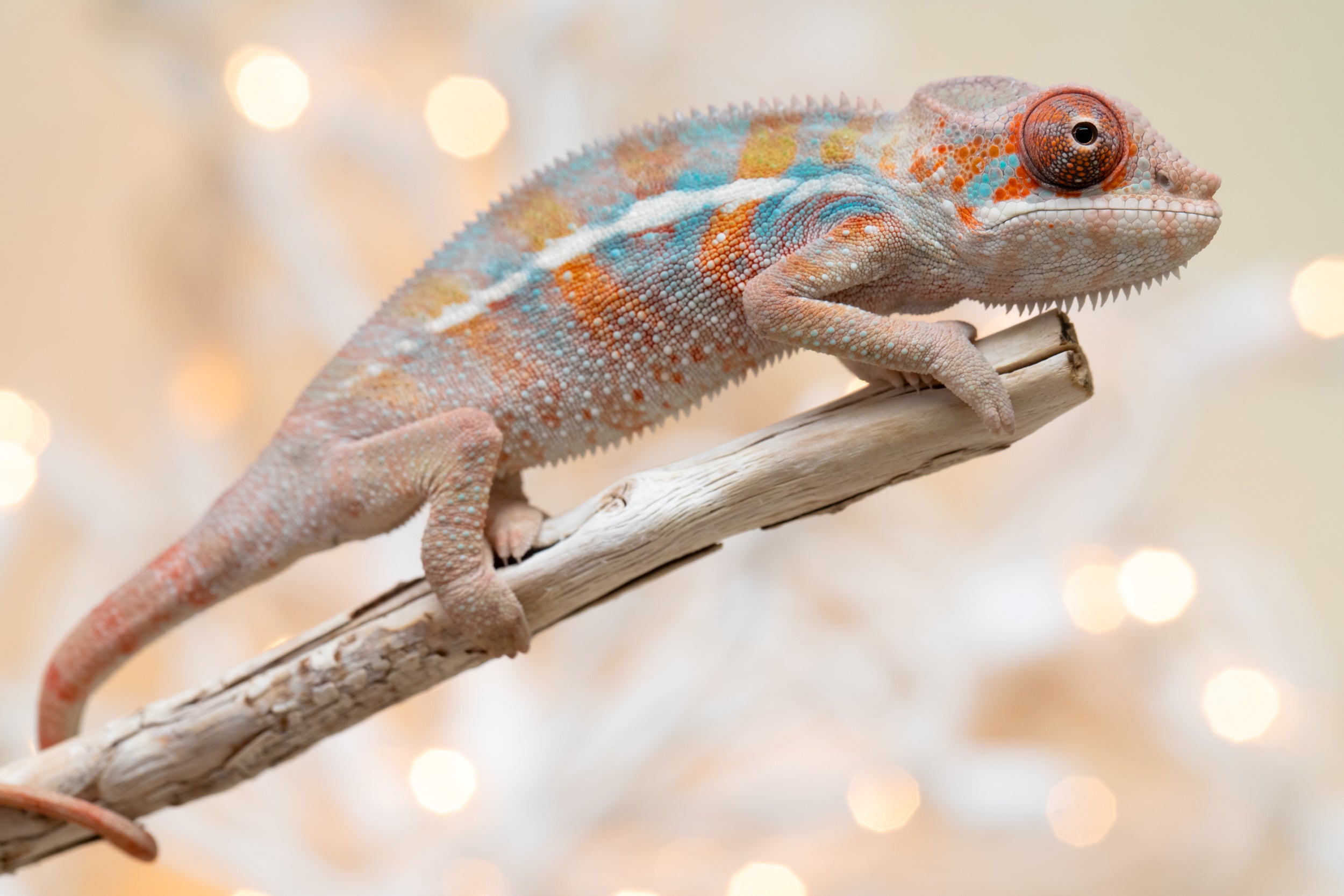 Baby Bio: OK, listen, this baby just absolutely stole the show!! And melted my heart in the process! A natural mood enhancer in baby chameleon form! Both his looks, and his personality were top notch. He is so little but already so colorful, I may as well have been photographing a 7 month old! And he could not have seemed more unbothered by the entire experience of having his first ever baby photo sesh! He has the sweetest face and the most beautiful coloring already. Lots of orange, defined blue bars, an ultra-clean pattern, and these big, beautiful orange eyes. I’m telling you, this little guy is special!